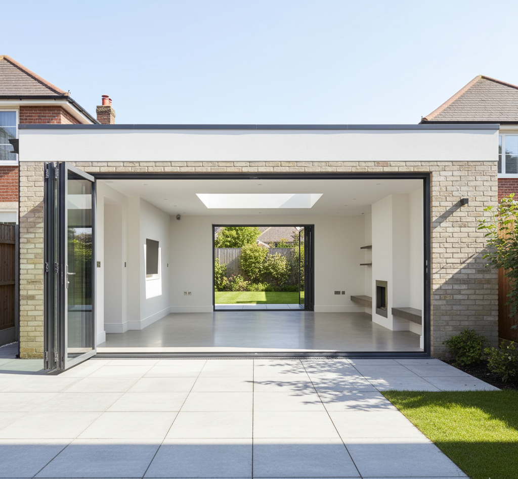 Added a spacious rear home extension featuring bi-fold glass doors that open onto a landscaped patio, connecting indoor and outdoor living.