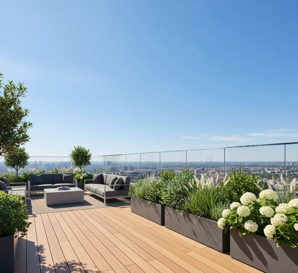 Designed a luxury roof terrace with decking, planters, and glass balustrades — ideal for relaxation and entertaining.