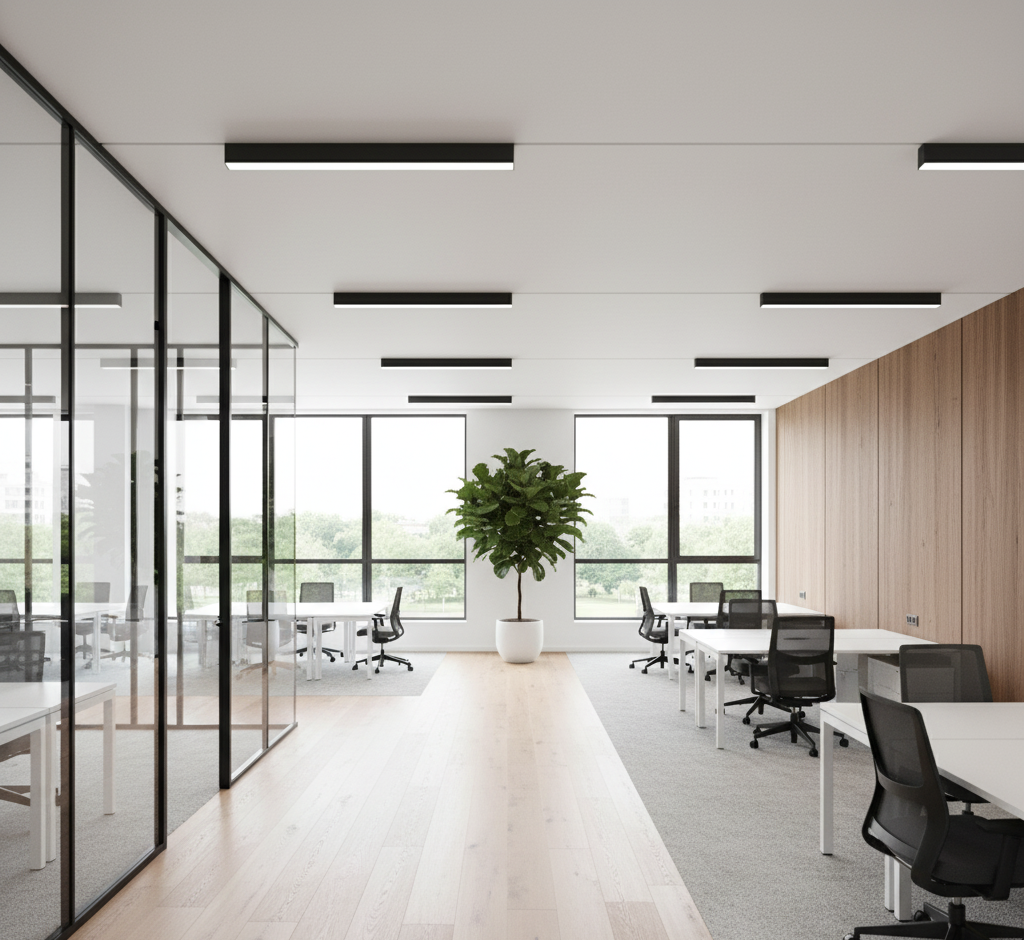 workspace transformation Complete workspace transformation with new flooring, glass partitions, lighting, and custom joinery to create a clean, productive office environment.